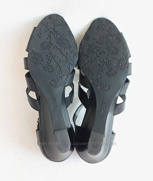 Босоніжки з натуральної шкіри, від Hotter. Колір чорний, прикрашени металевим декором. Вживані пару разів, стан загалом дуже добрий, трохи подряпані каблуки.Розмір вказаний 6 (39), повна довжина устілки всередині 25,3 см, ширина 8 см, танкетка 5 см.