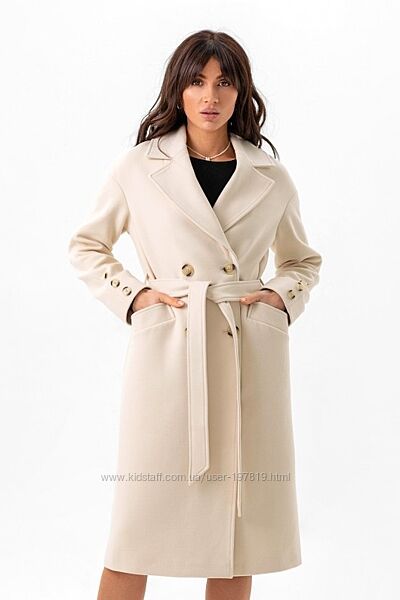 Модель широкого кроя, полномерная. Женское демисезонное пальто имеет 2 ряда пуговиц под отложным воротником. Меньшие пуговицы украшают рукава. Спущена линия плеча, за счет чего силуэт смотрится мягким. Удобные боковые карманы. Пальто за колено. Есть длинный пояс, который поможет сделать талию более выразительной.