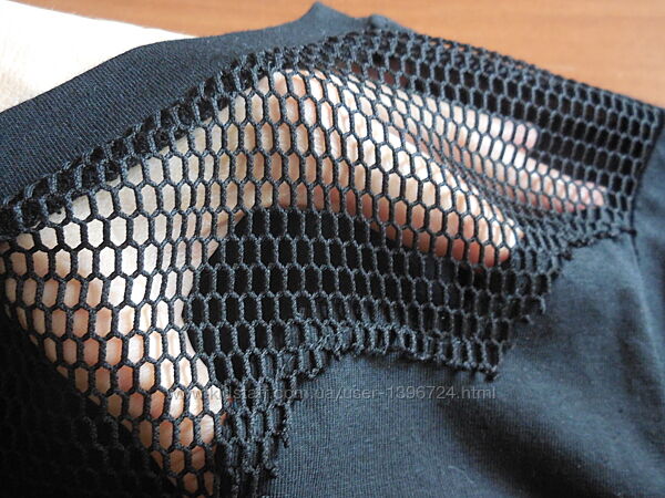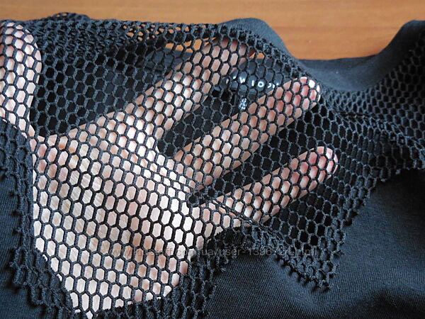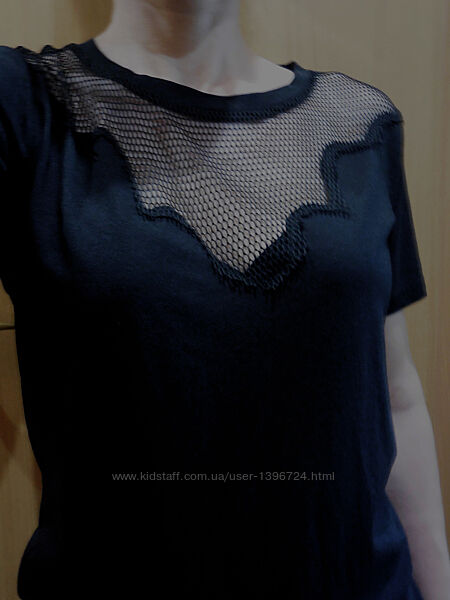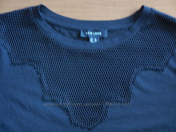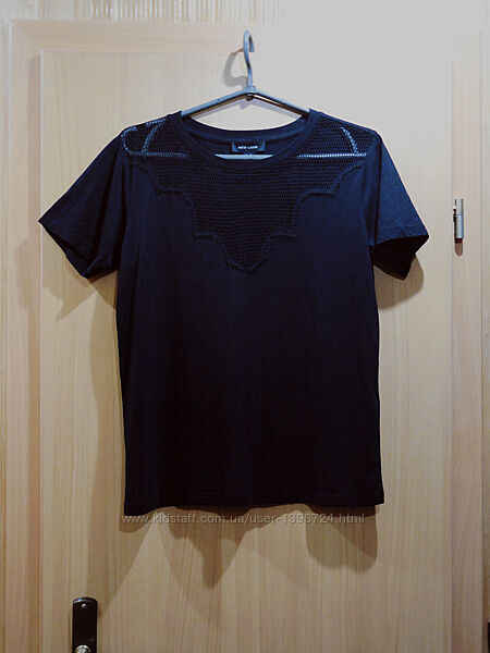 Легка футболка new look з ажурною вставкою Вказано розмір 10 UK, 38 EU Ширина в грудях 46 см., тягнеться. Довжина від плеча 60 см. Рукав від плеча 17 см., по шву 8 см. Тканина 47% бавовна, 53% модал. Пошито в Турції. Стан нової речі, без дефектів. Колір чорний, насичений, фото не передає.