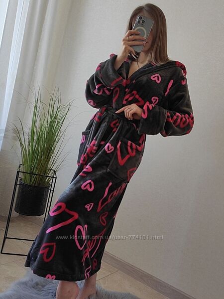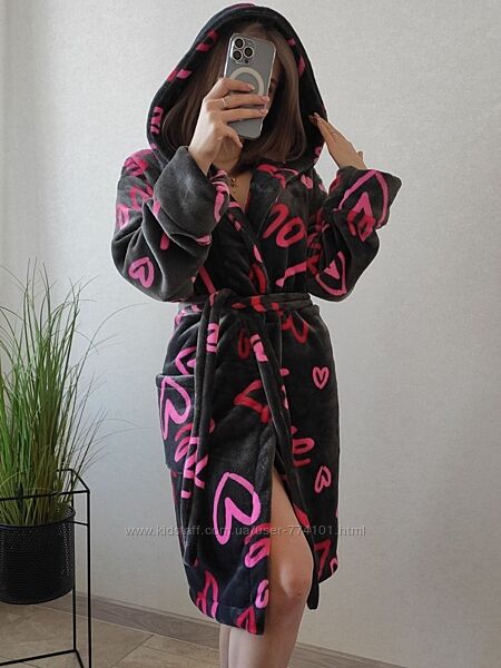 М´який, затишний та тепленький халатик з двостороннього велюр плюшу.З капюшоном , є кишені , пасок.