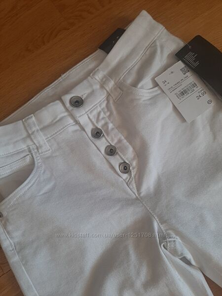 Джинси білі C&A р.34, стрейч, добре тягнуться і сідають по фігурі. Ширинка на металевих гудзиках.Заміри: ширина по талії - 33-34 см, ширина по бедрах - 42 см, довжина по зовнішньому шву - 100 см, довжина по внутрішньому шву - 75 см.