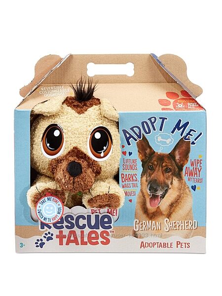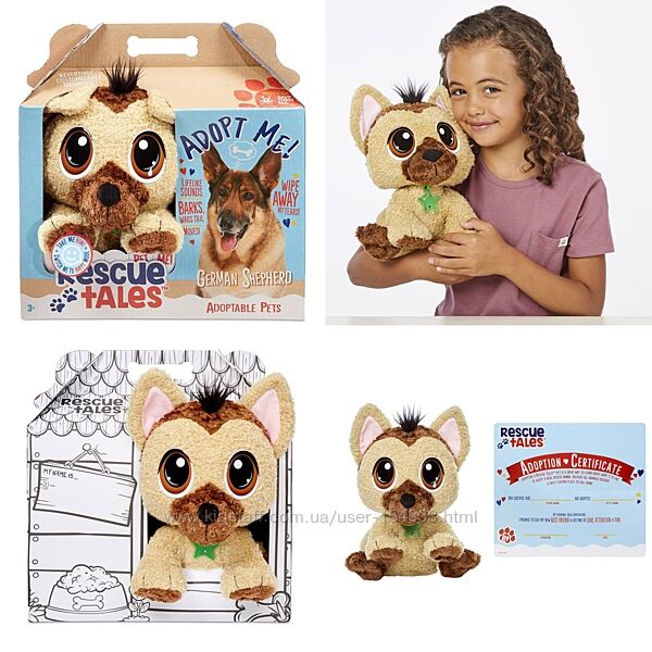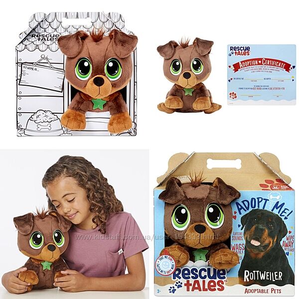 Rescue Tales - очаровательные плюшевые питомцы, которых можно усыновить и забрать к себе домой!!!Дети будут в восторге от того, как их Rescue Tales Adoptable Pet виляет хвостом, кивает головой и издаёт звуки, будто настоящий щенок. Он умеет скулить, рычать, звонко лаять и даже плакать!