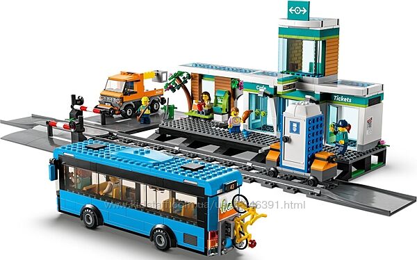 Набор Лего Сити «Железнодорожная станция» LEGO® City (60335) содержит множество замечательных функций, в том числе билетную кассу, кафе-бар, диспетчерскую, платформу и рельсы, совместимые с наборами поездов LEGO City. Также, в набор входит игрушечный автобус, коляска с переносным туалетом, которая едет как по дороге, так и по рельсам, и железнодорожный переезд для соединения с другими наборами Лего Сити. Совместим совсеми поездами из наборов Лего Сити.