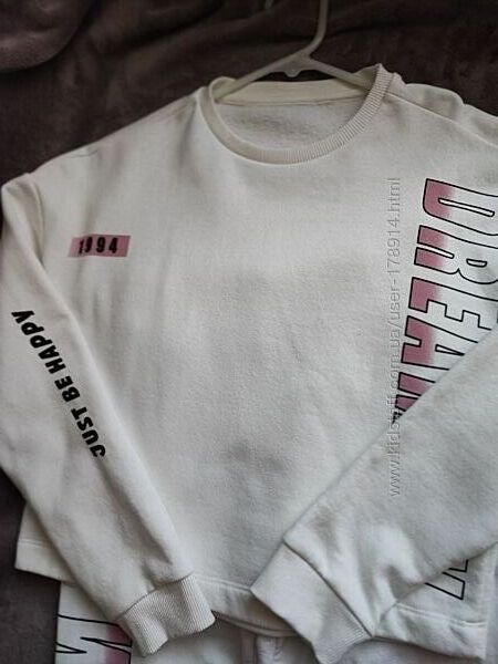 Спортивный костюм от C&A Утеплен флисом, цвет белый. Размер 146-152. Замеры реглан : длина по спинке 52 см .Длина рукава от плеча 50 см , ширина по плечам 53 см. Длина плечо+рукав 71 см. Ширина под рукавами 47 см. Замеры штаны : длина полностью 86 см. Шаговая длина 61 см. Ширина в поясе 32 см ( резинка).