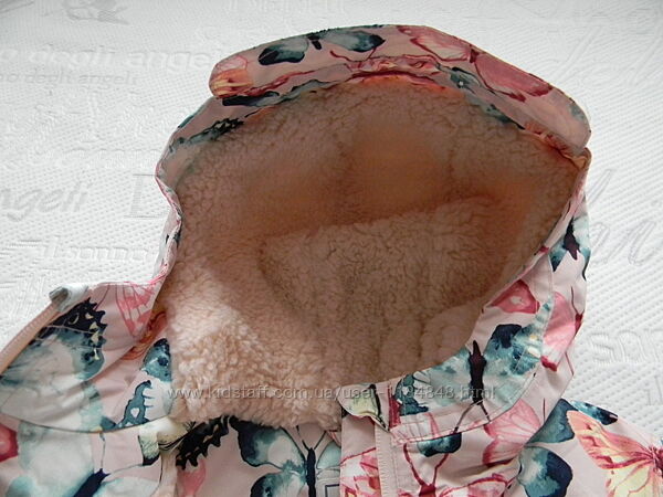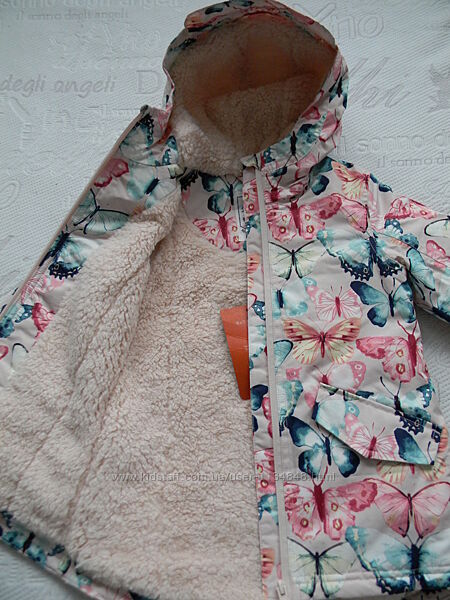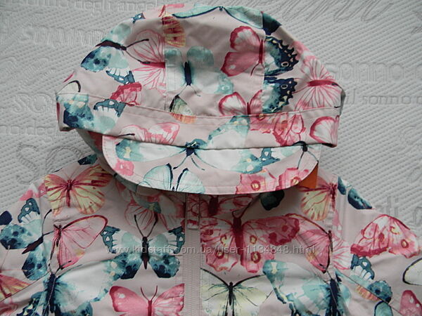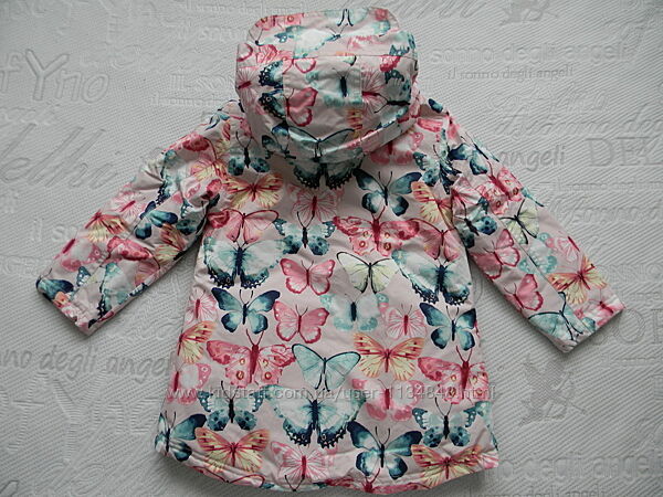 весенняя курточка, ветровка Mantaray с бабочками на 3-4 г. Подкладка меховушка, в рукавах нейлон. Капюшон с козырьком. Общий фон пудровый.----Замеры: дл по спинке-51 см, по груди-34 см, плечи-28 см, рукав-34 см ( 24 см).