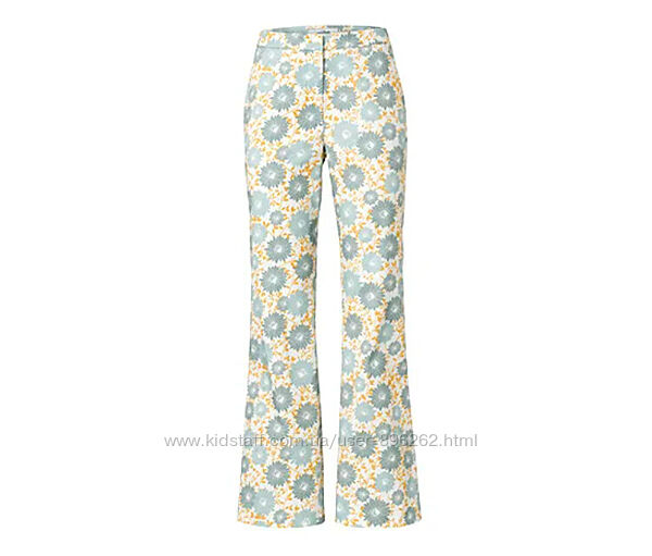 Зручні та еластичні брюки-кльош. Високий комір. Квітковий повний принт. З еластаном: зберігає форму, ідеальна посадка, високий комфорт при носінні. З органічної бавовни. З переробленого матеріалу. Перевірено на вміст шкідливих речовин - сторонніми, акредитованими інститутами.