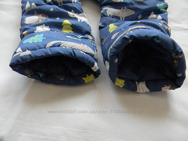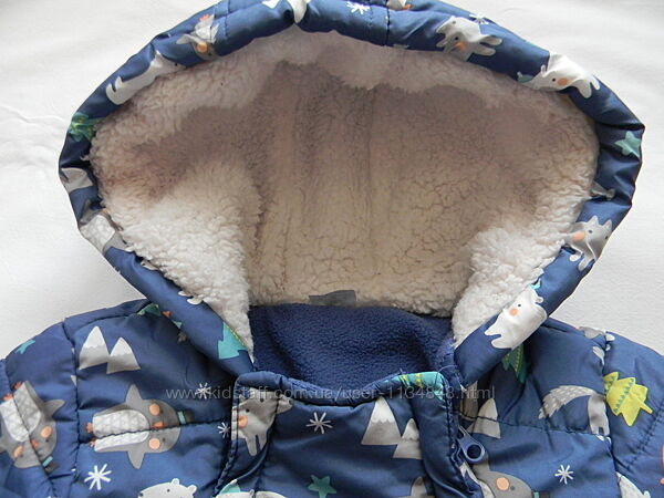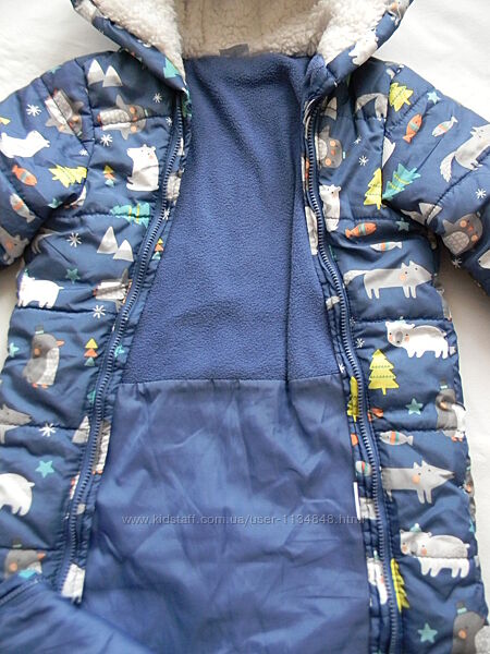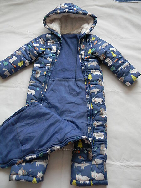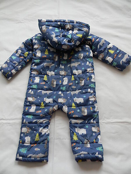 демисезонный комбинезон F&F на 12-18 мес. Утеплен синтепоном, по груди внутри флис, ниже нейлон. В целом состояние хорошее. Из дефектов: рукавичек нет, есть зацепка на одном рукаве , между ножек небольшой дефект по шву ( в носке не заметно).---Замеры: дл- 70 см , дл до памперса -45 см, шаг-24 см, по груди-32 см. , рукав-30 см ( 25 см )., плечи- 27 см.