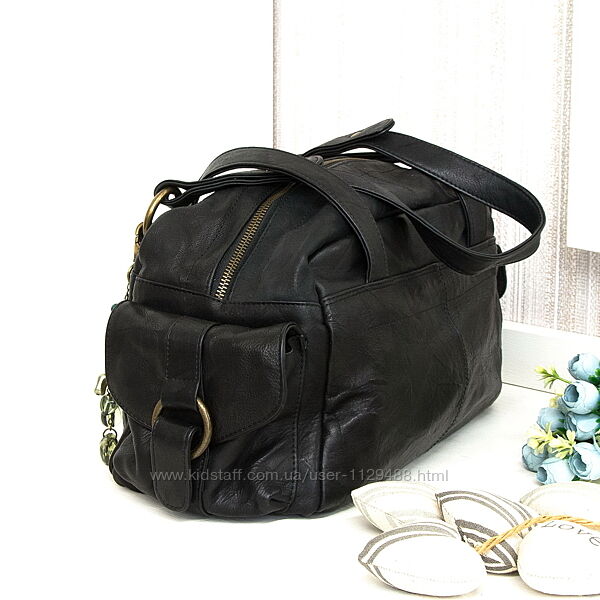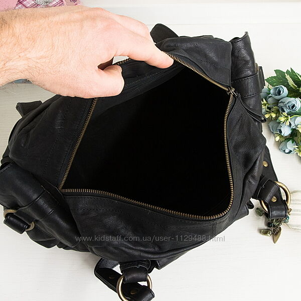 Большая, но не громоздкая, очень вместительная, универсальная--сгодится как для повседневной носки, так и для походов в спортзал, бассейн и как ручная кладь. Выполнена из очень прочной мягкой пластичной натуральной кожи великолепного качества, очень приятная на ощупь. Закрывается на молнию, внутри одно отделение, в нем карман на молнии и 2 открытых кармашка. На фасаде и по бокам объемные карманы под клапанами на магнитных кнопках. Донце плотное. Декоративный подвес съемный, на карабине.
