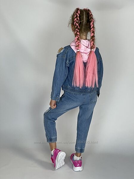 Стильний джинсовий комплект 3-ка для Вашої красунечки! Джинси, джинсова куртка з модним принтом, худі з капюшоном - осьідеальний образ для активного відпочинку чи прогулянок.