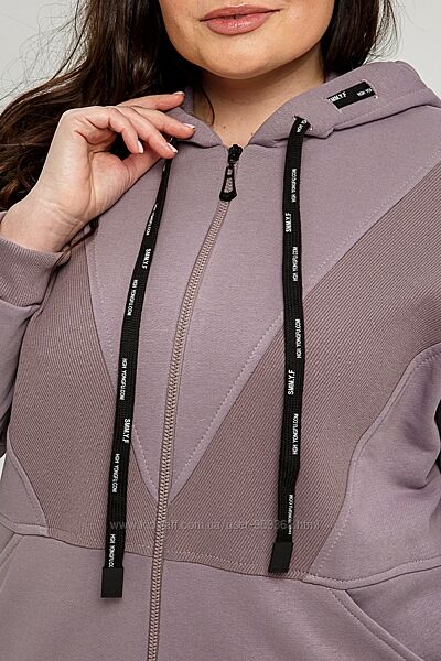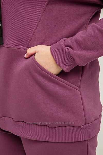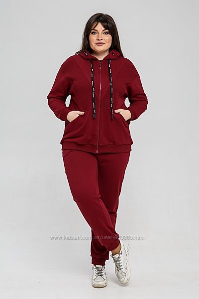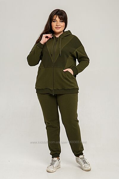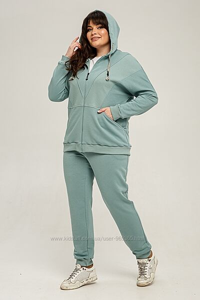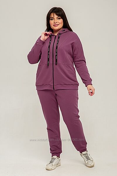 Комплект жіночий двопредметний, що складається з вітровки та штанів. Виконаний із трикотажного полотна «петля» (Туреччина). З лицьового боку тканина виглядає тонкою гладкою, в´язкою, з вивороту - рифлена фактура у вигляді дрібних повітряних петель, щільність - висока. Розтяжність тканини – середня. Висота капюшону регулюється за допомогою шнурка. Рукав втачний, одношовний, на манжеті. Попереду застібка на «блискавку». Штани прямого силуету на манжеті, спереду – кишені. Вставка по полиці, манжети штанів та вітровки виконані з рібани.
