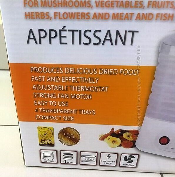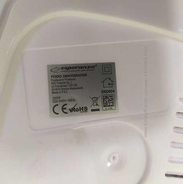 Привезенная из Европы сушка для фруктов Esperanza EKD004. Мощность потребления (макс.) - 250 Вт, количество лотков для фруктов - 4, регулировка температуры (8 режимов) от 35 до 75 градусов, встроенный вентилятор для циркуляции теплого воздуха, защита от перегрева, компактные габариты, размер лотков - 23,5 см, высота лотков - 2,5 см, высока сушки - 24 см, страна производства - Польша (КНР). Хорошее качество. Предоставляется настоящая документированная гарантия - 6 месяцев.Оплата - наложенный платеж либо предоплата на карту. Способы доставки: самовывоз, Новая Почта, Укрпочта, Деливери, Justin (отправка 2 раза в неделю). Возврат товара – в течении 14 дней при сохранении упаковки и отсутствии следов его использования.