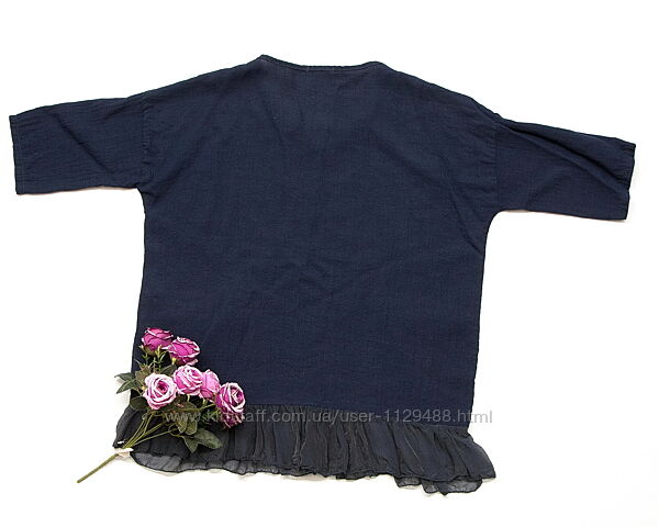 Удобная, практичная, выполнена из натуральной дышащей ткани, легко сочетается с любым низом. Крой свободный, оригинально обыграно сочетание фактур--чуть жатый хлопок, металлик, вязка и летящий нежный шелк. Смотрится очень эффектно.