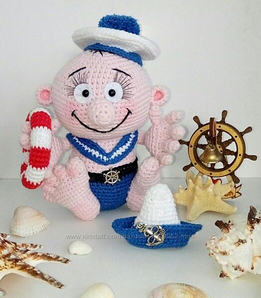 Морячок ручної роботи, в´язаний гачком, виконаний з пряжі YarnArt JEANS (55% Бавовна, 45% Поліакріл). Наповнювач - холлофайбер. В комплект входить дві шапочки і рятувальний круг.Разом з Моряком подаруйте вашій дитині яскраві емоції і радість!
