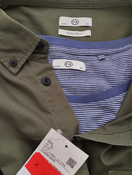 C&A – универсальный бренд для всей семьи. Основным достоинством одежды и обуви этой марки можно по праву назвать ее качество и долговечность за разумную цену. Будь то джинсы, брюки карго или брюки чинос: рубашка из хлопка завершает повседневный образ. Планка с непрерывными пуговицами. Накладной нагрудный карман. Закругленный подол. Ворот на пуговицах. Модель regular fit состав рубашка : 100% хлопок - ткань плотная . цвет: хаки состав футболка : 100% хлопок - трикотаж . цвет: серо-голубой Качественная, стильная вещь первая цена 29,90 € Новый. рубашка с биркой