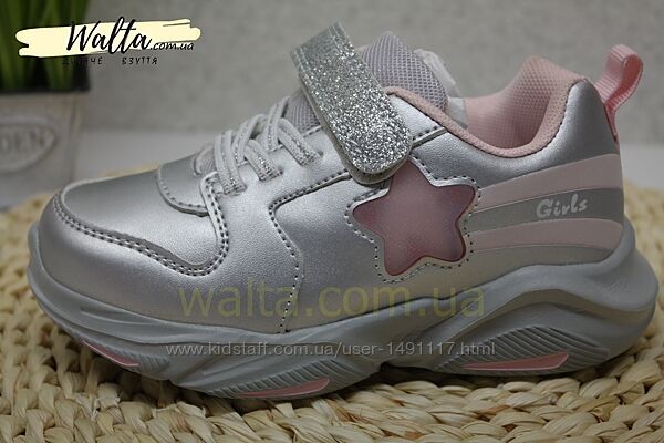 Стильні зручні кросівки від фірми том.м Вікі, легенькі. Збоку в районі зірочки мигалка. Срібні з рожевим. На шнурівці+липучка. На липучці блискітки.