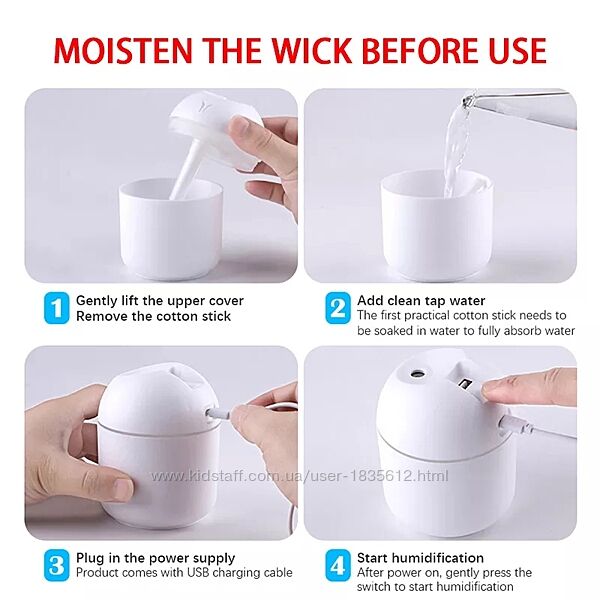 Увлажнитель с светодиодной подсветкой разноцветной, цвета плавно переходят из одного в другой., ночью светится как ночник. Есть подсветка несколькими цветами.Можно добавлять аромамасла, запах буде на всю квартиру но!!!