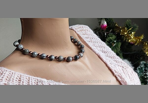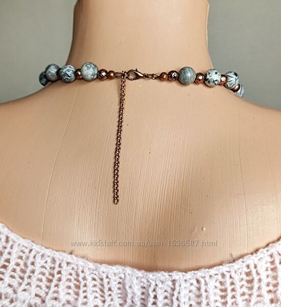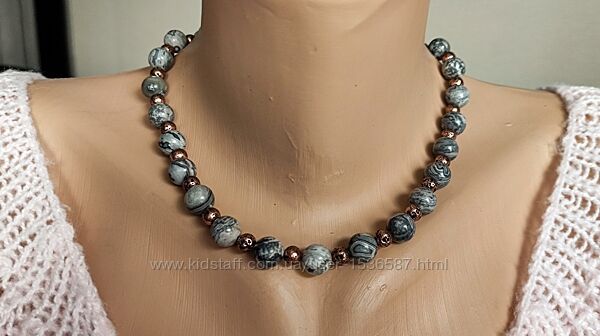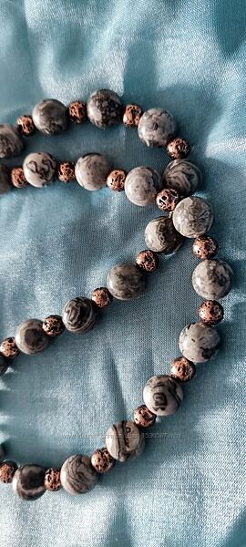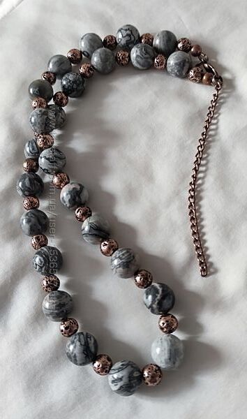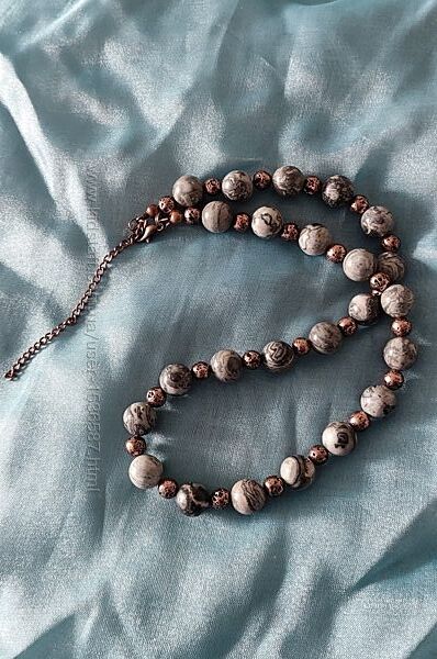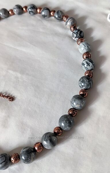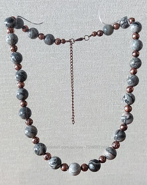 Кольє ′Яшма і вулканічна лава′ зібране з натуральної яшми сірого кольору і вулканічної лави, тонованої під рожевий колір міді, на міцному металевому ювелірному тросику. Намистини яшми розміром 10 мм мають красивий малюнок, намистини вулканічної лави мають розмір 6 мм. Також використана металева фурнітура мідного кольору. Застібка надійна.Довжина кольє - 44 см плюс 8 см подовжуючий ланцюжок.