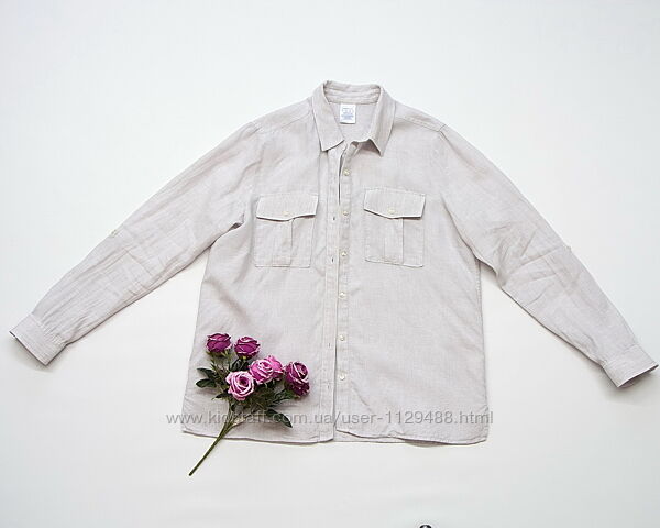 Девочки, льняная рубашка обязательно должна быть в грамотно составленном гардеробе.Удобная, практичная, стильная, приятного нейтрального бежевого цвета. Крой свободный, прямая, 2 нагрудных кармана под клапанами, рукава с подхватами. Выполнена очень качественно, из натуральной дышащей ткани, очень приятная к телу.