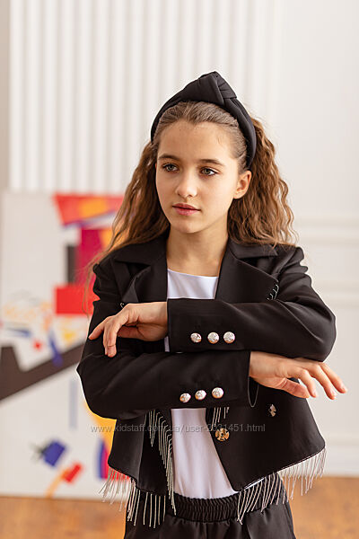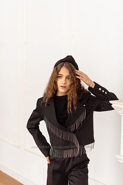 🔸Пиджак укороченный, с заострёнными лацканами двубортный, застёгивается на пуговицы, с украшением бахромой.