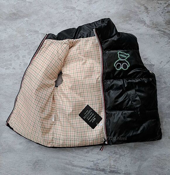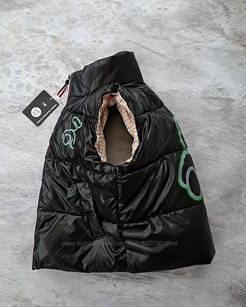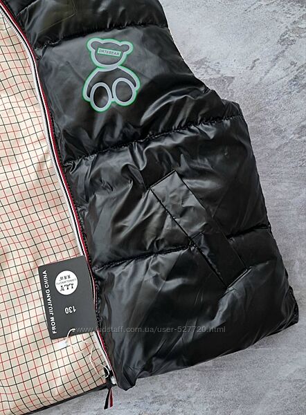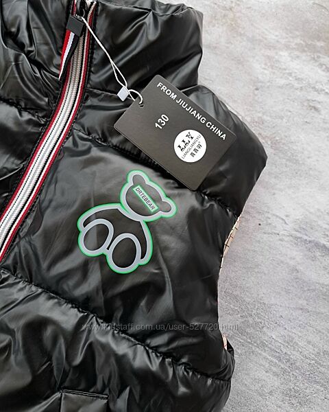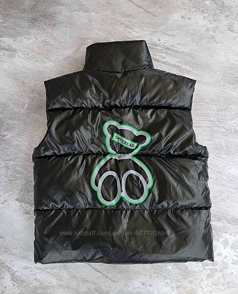 Демисезонная детская жилетка выполнена из блестящей лаковой ткани плащевки. Такая ткань имеет красивый отблеск, не промокает, не продувает. Модель прямого кроя, застегивается на молнию, имеет высокий воротник, врезные боковые карманы. Сбоку в районе груди и на спине принт медвежонка.Цвет: черный