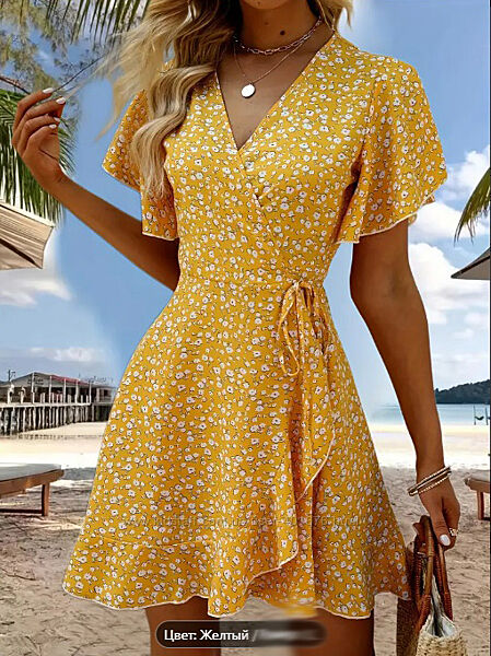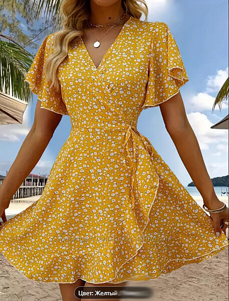 Легкое, красивое платье, по талии отрезное на запах, юбка расклешенная по низу волан, короткие рукава волан. Ткань тонкая, легкая, приятная на ощупь и на тело.