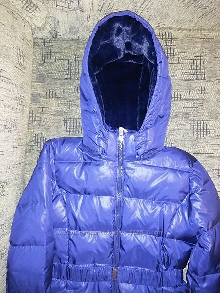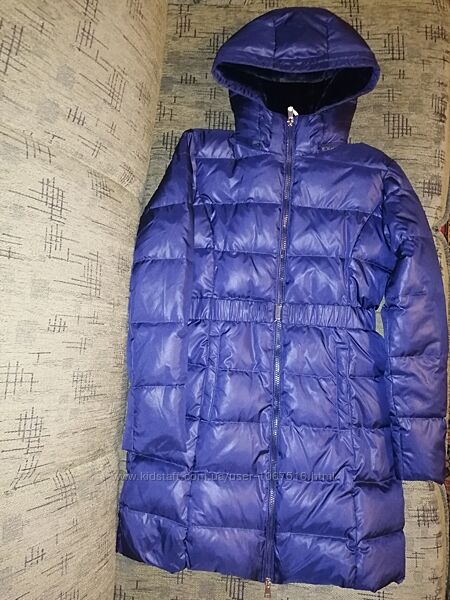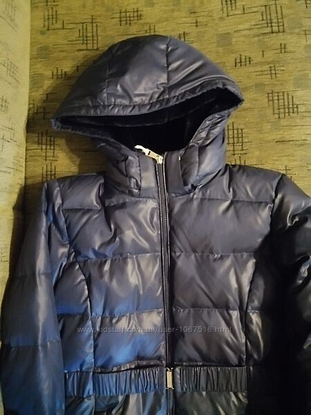Натуральный пуховик итальянского бренда. Наполнитель натуральный пух и перо 50/50. Внутри красивая подкладка из искусственного меха. Пуховик очень легкий и теплый.Капюшон острагивается. Фасон прямой. Размер 158-164. Цвет темно синий, не яркий.