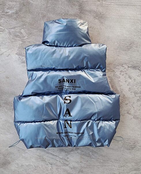 Демисезонная детская жилетка выполнена из лаковой ткани плащевки. Такая ткань имеет красивый отблеск, не промокает, не продувает. Модель прямогокроя, застегивается на молнию, а сверху прикрывается планкой, имеются