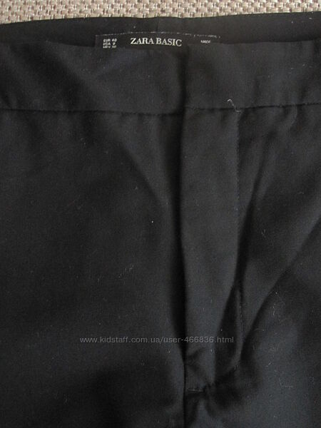 Чорні жіночі брюки 7/8 від Zara. Б/у у відмінному стані. Розмір 40. Склад тканини 65 ПЕ, 31 віскоза, 4 еластан. Тканина середньої щільності, брючна. Не сильно облягаючого фасону.Заміри