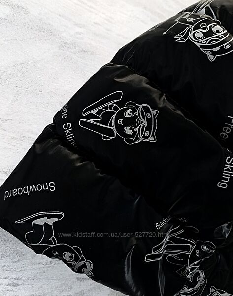 Демисезонная детская жилетка в принт выполнена из лаковой ткани плащевки. Такая ткань имеет красивый отблеск, не промокает, непродувает. Модель прямого кроя, застегивается на молнию, имеет высокий