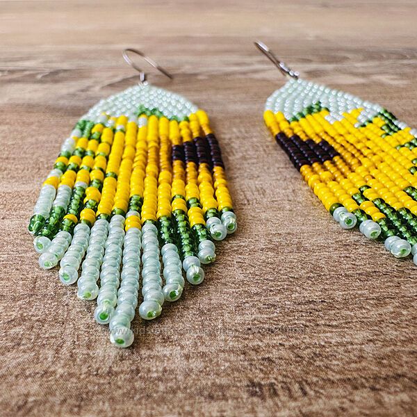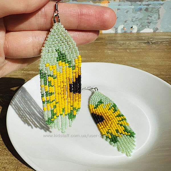 Подробное описание: Бисерные серьги Подсолнухи, Серьги из бисера с бахромой и цветочным узором