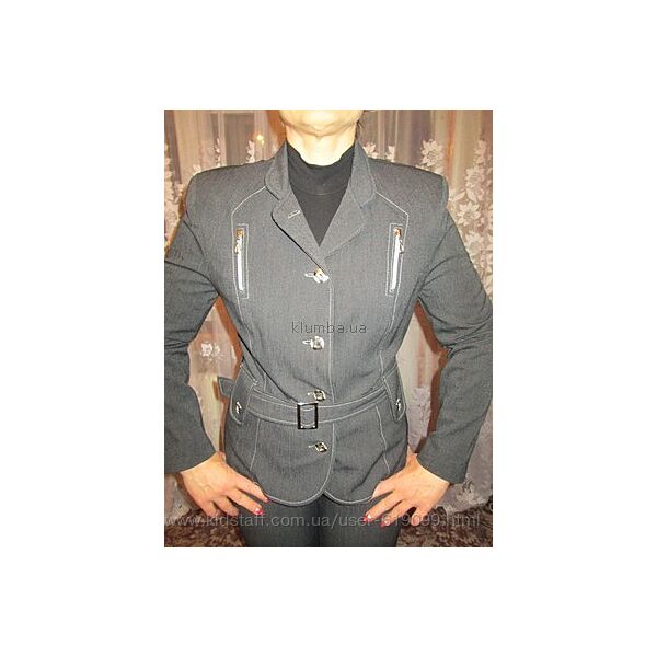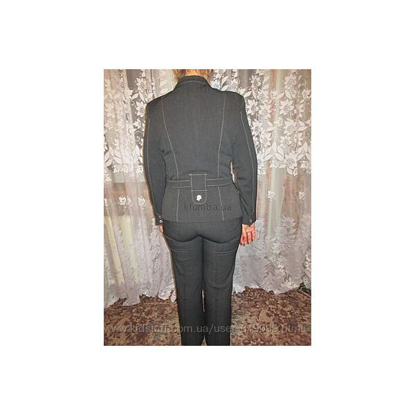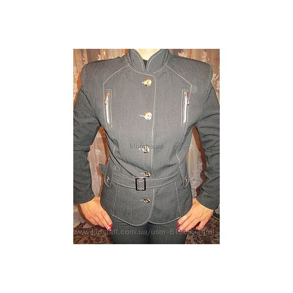 Деловой женский , брючний костюм украинской фирмы "Панночка" из тонкой костюмной ткани ,с добавлением эластана, темно серого цвета( в рубчик). Костюм состоит из классических брюк( штанина широкая, прямая) и пиджака на 5 пуговиц.Пиджак - ворот стойка, можно застегнуть на 5 пуговиц под воротник, можно на 4 и отвернуть лацканы. Пиджак под пояс с пряжкой, пиджак на подкладке. Отделка пиджака декоративная строчка и 2 молнии имитация карманов. Брюки прямые, посадка высокая. Ткань костюмная плотная, но не толстая, немного тянется, т к в состав входит эластан Смотрится очень эффектно. Одевался 1 раз- стал мал. Состояние нового, отличное . Реально подойдет на бедра 98-102 см. На рост 160-164 см. У модели бедра 103 см и плотненько, но влезла.( ткань тянется). Пиджак на бюст 46-48-го размера.( у модели объем груди 93 см).