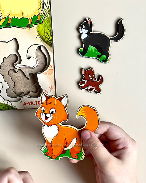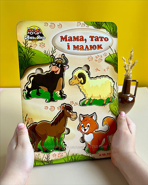 Тришаровий пазл, 4 сім´ї - 12 фігурок домашніх тварин (по 3 штуки кожного виду: тато-мама-малюк), які необхідно вкладати на своє місце за формою і розміром.За допомогою таких вкладишів можна легко пояснити дитині поняття "великий", "середній" та "маленький", пограти в гру "Де чий малюк, мама чи тато?" Вкладиші легко дістаються пальчиком.