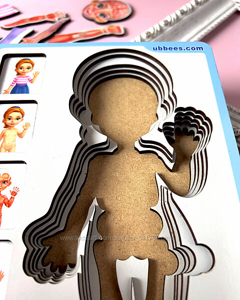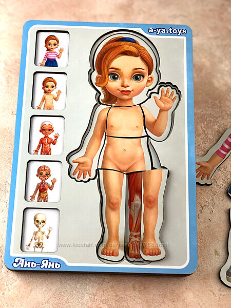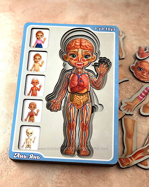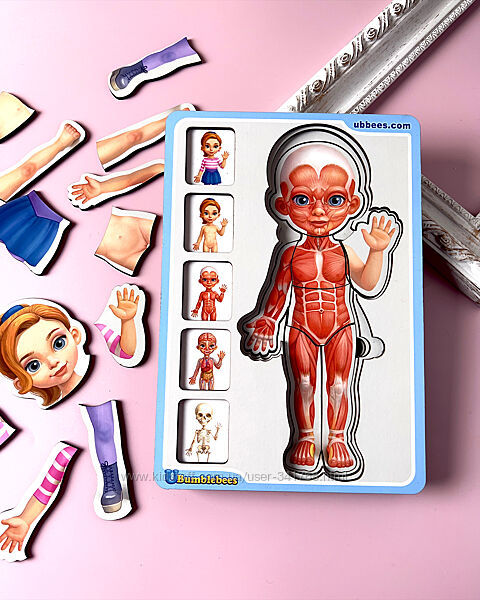 Познайомити дитину з особливостями будови людського організму можна весело і граючи. 5-ти шаровий пазл - це наче посібник для вивчення скелета, м´язової тканини, кровоносної системи, шкірного покриву та зовнішнього вигляду людини в одязі.Види пазла: