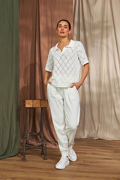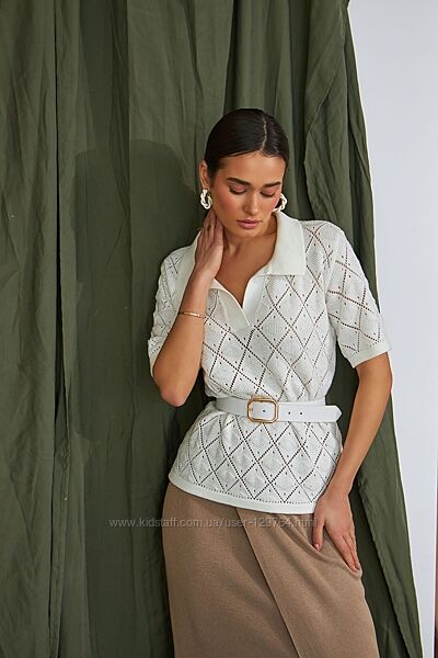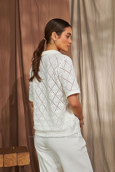 Туніка-поло виконана з натуральної пряжі з включенням бавовни та віскози, прямого силуету зі спущеною комфортною лінією плеча в пластичному та стабільному переплетенні, що добре тримає форму.Виріб має чисто вив´язаний V-подібний виріз горловини, доповнений відкладним комірцем-поло і короткий втачний рукав.