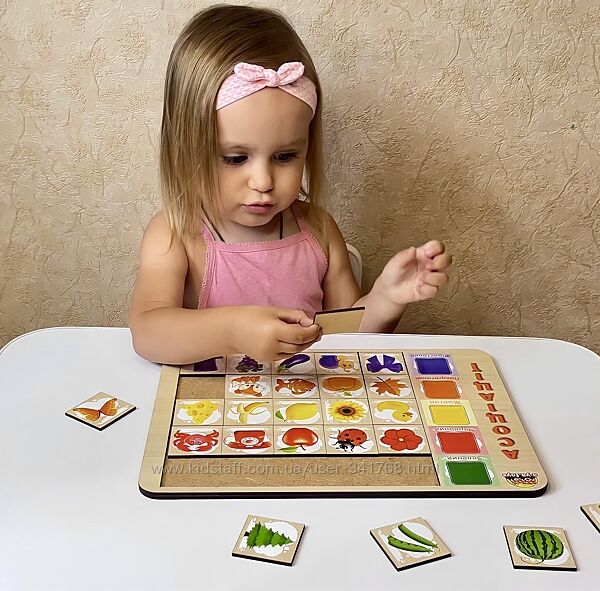 У наборі: дерев´яний планшет-рамка, на якій зображено у рядок п´ять кольорових квадратів, 25 плашок з предметами або персонажами різних кольорів.Необхідно правильно зібрати 5 рядків плашок з зображенням предметів і персонажів за кольором квадратиків.