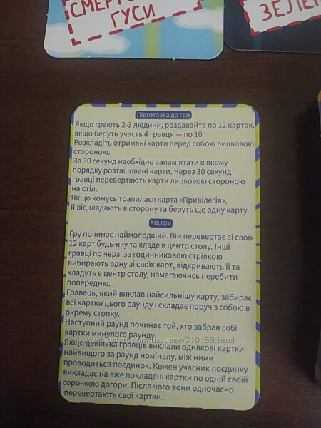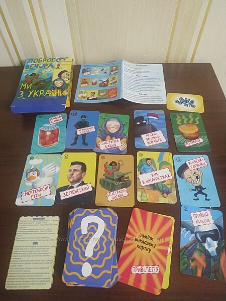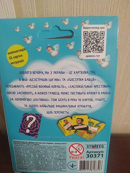 Настільна гра Strateg Доброго вечора, ми з України — це карткова гра, в якій «київські гопники» та «безстрашні цигани» перебивають «рускій воєнний корабль», «заспокійливий Арестович» дійсно заспокоює, а кожен гравець може поставити крапку в раунді за допомогою «паляниці». Комплектація: 52 картки; інструкція. Грати дуже просто та весело, особливо, якщо ви справжні українці. Всім роздають по 12 карт відкритими, які потрібно швидко запам´ятати та перевернути. А далі гравці викладають по одній картці, намагаючись викласти таку, яка буде вище номіналом за картки суперників. Якщо вийшло — гравець забирає всі карти собі. І для перемоги гравцеві потрібно зібрати якомога більше.Рекомендовано підліткам і дорослим.
