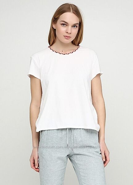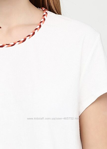 Стильная модная футболочка белого цвета из коллекции Хейди Клум. Отличная модель, круглый вырез горловины украшен плетеной косичкой, что создает неповторимый образ. Свободный крой. Приятная мягкая ткань на ощупь из-за высокого качества хлопка. Тонкая, легкая, прекрасно