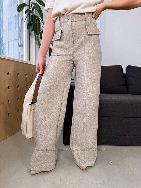 Наші Вовняні штани є комфортними, стильними штанами виконані у вільному стилі. Вони мають широкі штанини та декоративні шви, які додають їм структурності. Штани оснащені двома накладними кишенями із клапанами на ґудзиках у верхній частині. Пояс застібається на блискавку і доповнений гумкою позаду.Матеріал вовна на основі є теплим і м´яким, що робить ці штани придатними для холодної пори року.