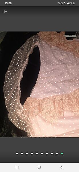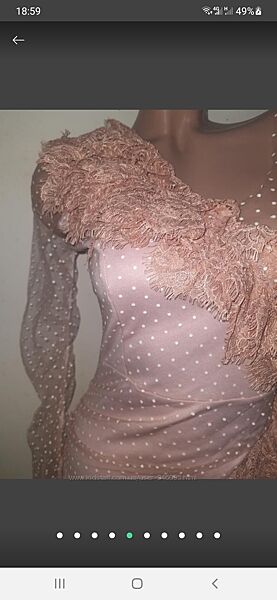 Міні-сукня SBR - виконана з м´якого напівпрозорого та еластичного шифону в горошок та мережива. Він має сексуальний асиметричний крій , довгі рукави, оборки щоб показати якомога більше чи менше ноги. Він повністю на підкладці,(крім рукавів) тому ефект напівпрозорий.Д.від плеча 89 см