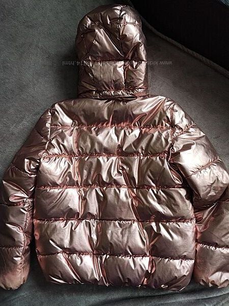 Куртка демисезонная от H&M Размер 9 рост 134. Замеры: длина по спинке 51 см. Длина рукава от плеча 50 см. Плечи 37 см. Ширина под рукавами 46 см. Капюшон сьемный. Цвет розовое золото. Местами стерлось покрытие, на фото 5-8 показала. Цена 150 грн.