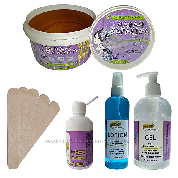 Набір для шугарингу Madam Saharina паста тверда 400 г, лосьйон до і гель "папайя" після депіляції, тальк, шпателіЦукрова паста для шугарингу Madam Saharina – це 100% натуральна і безпечна паста, до складу якої входить цукор, вода та відсутні будь-які барвники і хімічні добавки.