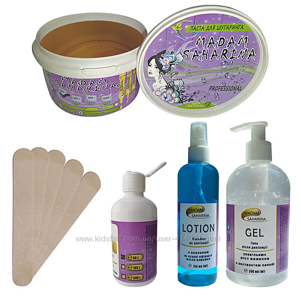 Набір для шугарингу Madam Saharina паста м´яка 400 г, лосьйон до і гель "папайя" після депіляції, тальк, шпателіЦукрова паста для шугарингу Madam Saharina – це 100% натуральна і безпечна паста, до складу якої входить цукор, вода та відсутні будь-які барвники і хімічні добавки.