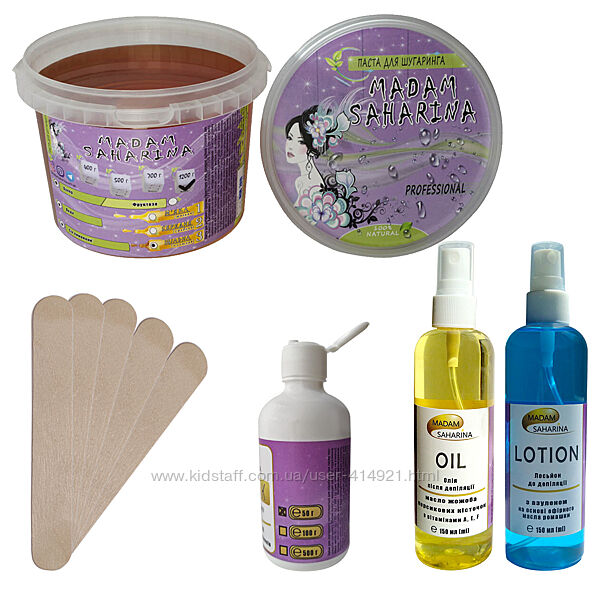 Набір для шугарингу Madam Saharina паста тверда 1200 г, лосьйон до і лосьйон- олія після депіляції , тальк, шпателіЦукрова паста для шугарингу Madam Saharina – це 100% натуральна і безпечна паста, до складу якої входить цукор, вода та відсутні будь-які барвники і хімічні добавки.