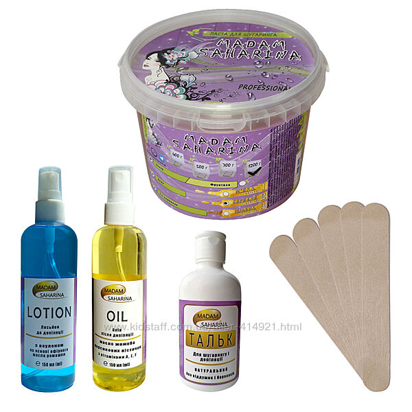 Набір для шугарингу Madam Saharina паста середня 1200 г, лосьйон до і лосьйон-олія після депіляції, тальк, шпателіЦукрова паста для шугарингу Madam Saharina – це 100% натуральна і безпечна паста, до складу якої входить цукор, вода та відсутні будь-які барвники і хімічні добавки.