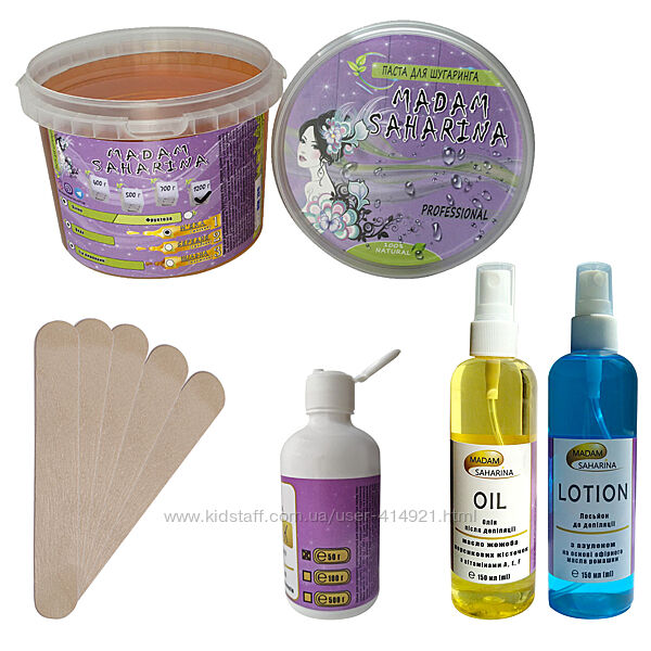 Набір для шугарингу Madam Saharina паста м´яка 1200 г, лосьйон до і лосьйон- олія після депіляції, тальк, шпателіЦукрова паста для шугарингу Madam Saharina – це 100% натуральна і безпечна паста, до складу якої входить цукор, вода та відсутні будь-які барвники і хімічні добавки.