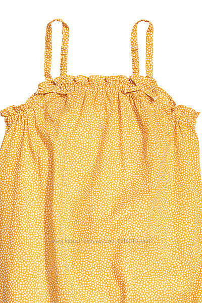 Свободный комбинезон из мягкой хлопковой ткани; узкие бретели и резинка сверху; резинка и оборка по низу брючин, а также кнопки внизу.