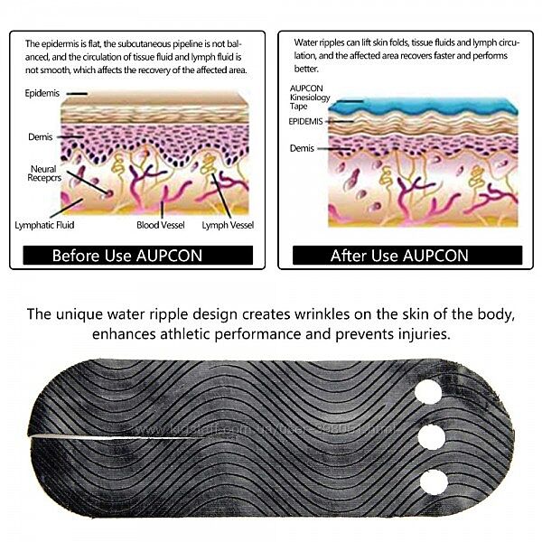 Кинезии тейп (kinesio tape) поднимает кожу над травмированными мышцами и связками, обеспечивает им поддержку, уменьшает боль и повышает функциональность сустава.