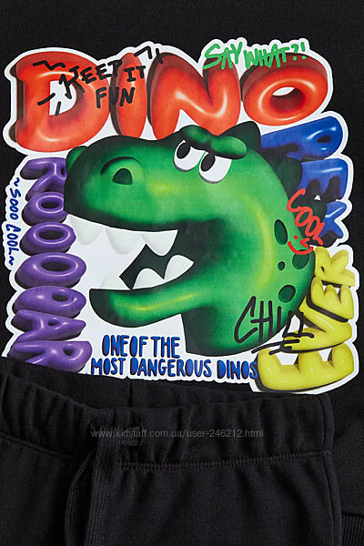 Чорний колір костюма надає йому строгість, а яскравий принт динозавра додає грайливості та динамізму. Костюм виконаний з легкої та міцної тканини, яка забезпечує комфорт та свободу рухів.