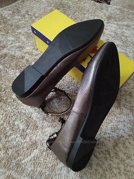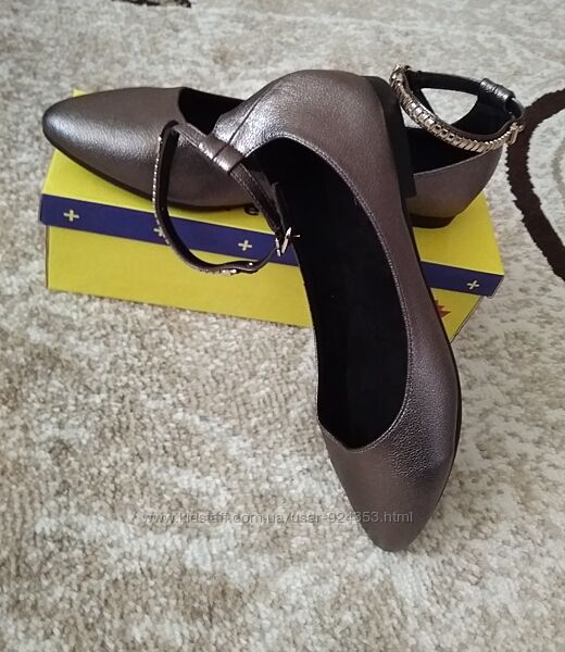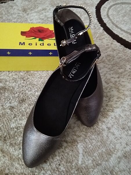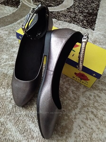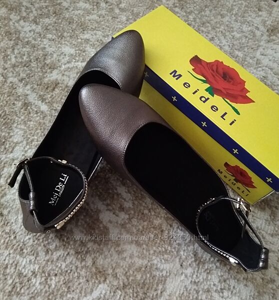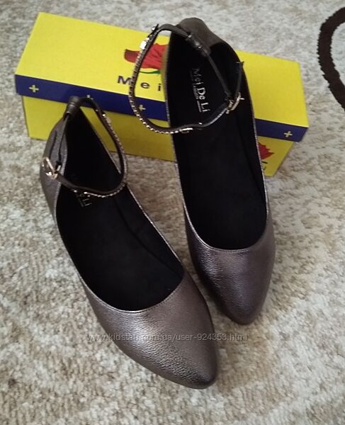 Очень красивые новые балетки графитового (металлик, темно-серый) цвета.ТМ MeiDeLi, указан размер 41, подойдут на р 40 – по стельке 26 см, ширина по стельке 8см, высота обуви сзади 8 см, длина ремешка 29 см, подойдут на среднюю ногу.