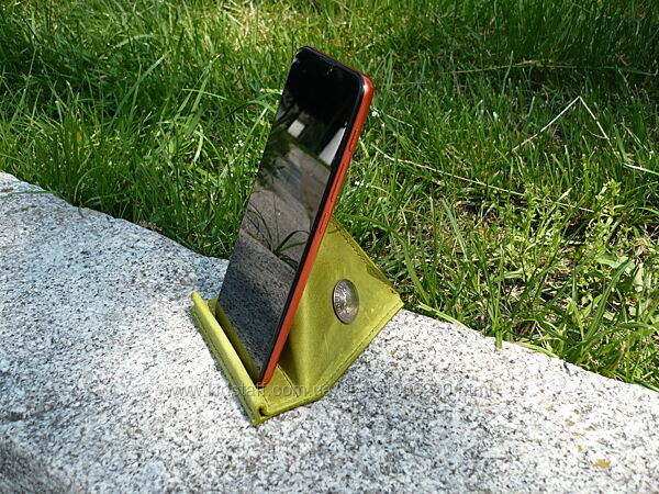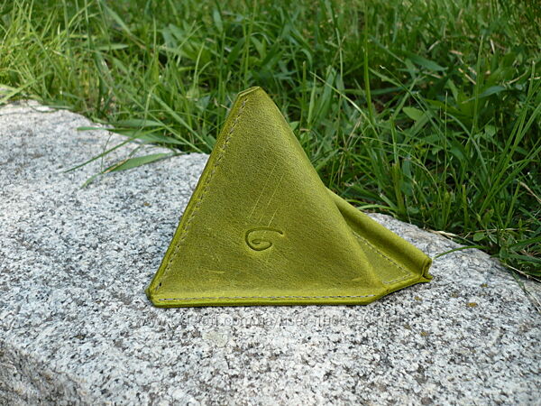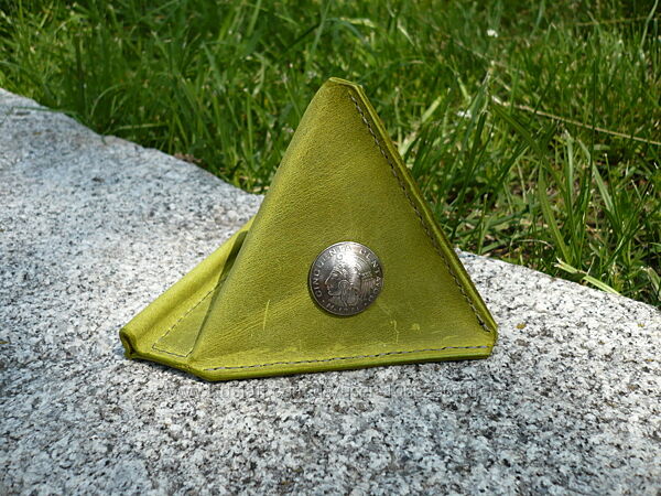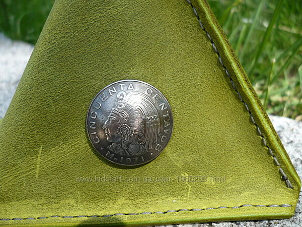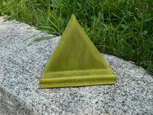 Кожаная подставка для телефона пирамидка-Мексика. Размер: 120*110*85 мм. Кожа КРС «crazy horse» производства Турции, цвет зеленый-лайм. Прошита вощеной нитью, урезы обработаны средством tokonole (Япония). Одна сторона пирамиды украшена декоративным кончо из мексиканской монеты . Ручная работа. Ценность: 500 грн.